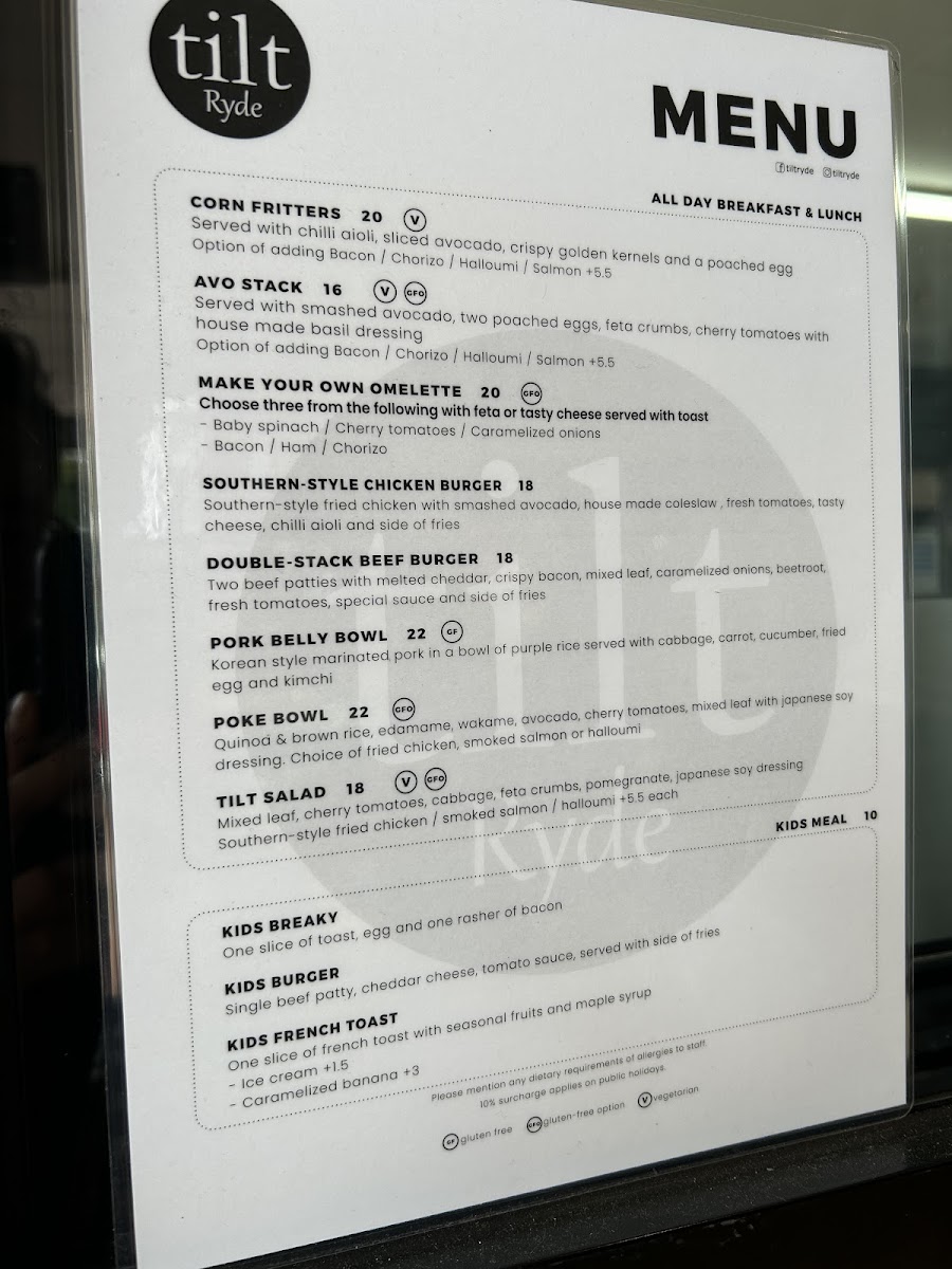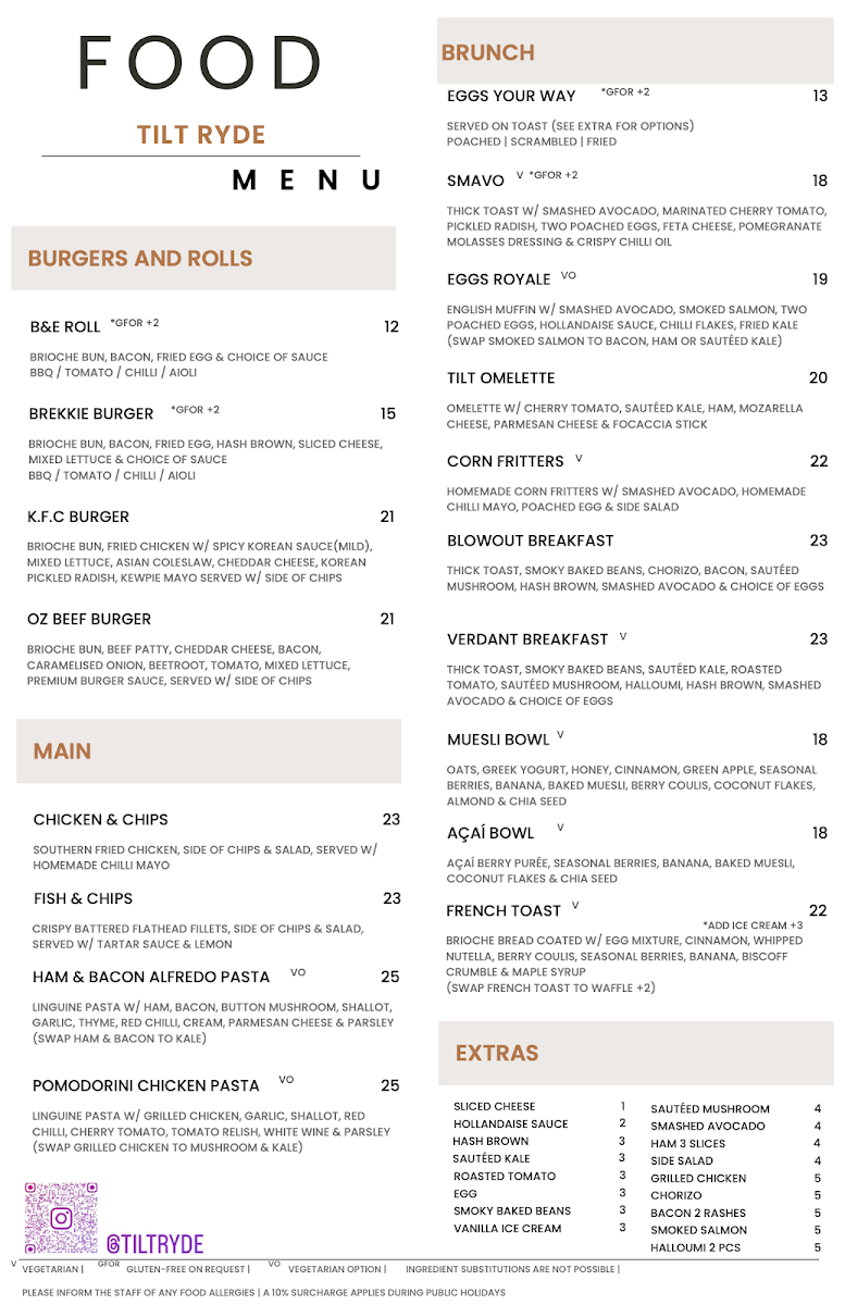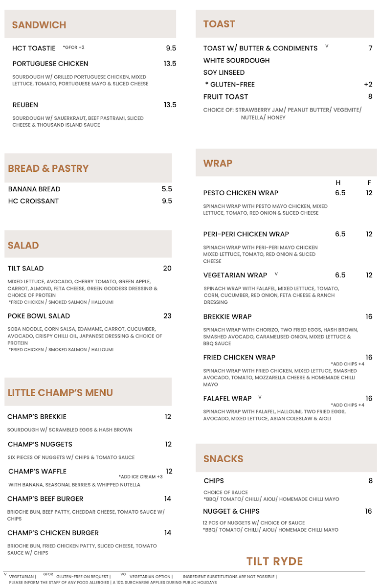 Wrapping up my look at Tilt Ryde’s menu at 2/22 Blenheim Rd, North Ryde NSW 2113, you can tell this is a café that aims to cover every kind of craving without overcomplicating things. The brunch line-up is especially inviting, with classics and comfort picks like EGGS YOUR WAY, SMAVO, EGGS ROYALE, TILT OMELETTE, and CORN FRITTERS-the kind of options that work whether you want something light or a more filling start to the day. If you’re after something handheld, the burgers and rolls section is a clear crowd-pleaser, featuring B&E ROLL, BREKKIE BURGER, K.F.C BURGER, and OZ BEEF BURGER. For more substantial meals, the mains keep it simple and satisfying with CHICKEN & CHIPS, FISH & CHIPS, HAM & BACON ALFREDO PASTA, and POMODORINI CHICKEN PASTA. There’s also a strong selection for quick bites, including sandwiches like HCT TOASTIE, PORTUGUESE CHICKEN, and REUBEN, plus straightforward toast choices such as TOAST W/ BUTTER & CONDIMENTS and FRUIT TOAST. If you’re in a pastry mood, BANANA BREAD and HC CROISSANT round things out nicely. The wrap section is one of the most extensive, offering PESTO CHICKEN WRAP, PERI-PERI CHICKEN WRAP, VEGETARIAN WRAP, BREKKIE WRAP, and FRIED CHICKEN WRAP, while those wanting something fresher can go for TILT SALAD or POKE BOWL SALAD. Families are well looked after too, thanks to the Little Champ’s menu-CHAMP’S BREKKIE, CHAMP’S NUGGETS, CHAMP’S WAFFLE, CHAMP’S BEEF BURGER, and CHAMP’S CHICKEN BURGER-and snacks like CHIPS or NUGGET & CHIPS make it easy to add a side or keep things casual. Overall, it’s a broad, practical menu that feels designed for repeat visits, with plenty of choice across breakfast, lunch, and kid-friendly comfort food.