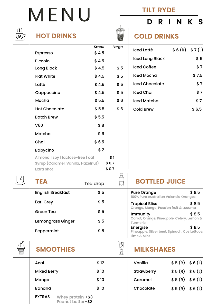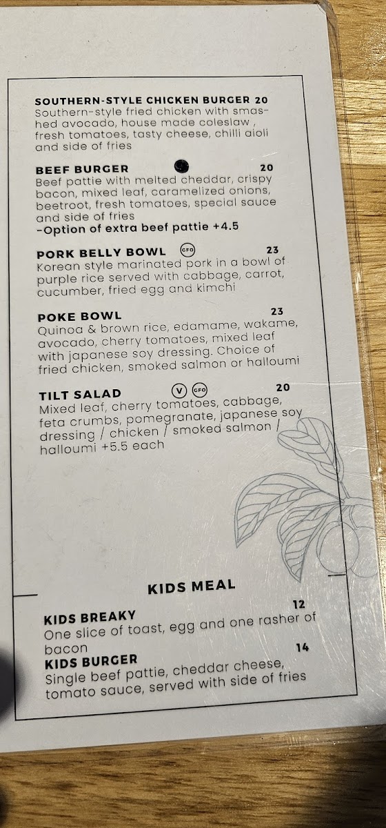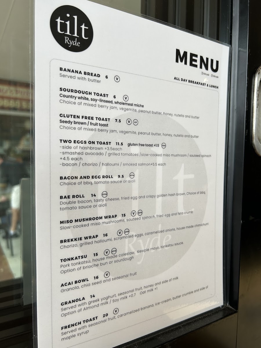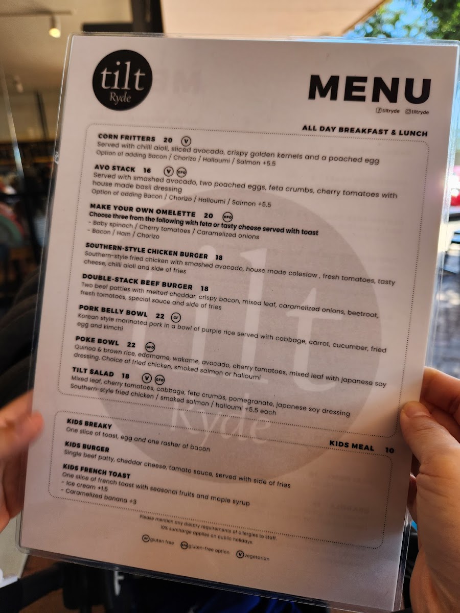 Wrapping up my look at Tilt Ryde’s menu at 2/22 Blenheim Rd, North Ryde NSW 2113, you can tell this is a café that aims to cover every kind of craving without overcomplicating things. The brunch line-up is especially inviting, with classics and comfort picks like EGGS YOUR WAY, SMAVO, EGGS ROYALE, TILT OMELETTE, and CORN FRITTERS-the kind of options that work whether you want something light or a more filling start to the day. If you’re after something handheld, the burgers and rolls section is a clear crowd-pleaser, featuring B&E ROLL, BREKKIE BURGER, K.F.C BURGER, and OZ BEEF BURGER. For more substantial meals, the mains keep it simple and satisfying with CHICKEN & CHIPS, FISH & CHIPS, HAM & BACON ALFREDO PASTA, and POMODORINI CHICKEN PASTA. There’s also a strong selection for quick bites, including sandwiches like HCT TOASTIE, PORTUGUESE CHICKEN, and REUBEN, plus straightforward toast choices such as TOAST W/ BUTTER & CONDIMENTS and FRUIT TOAST. If you’re in a pastry mood, BANANA BREAD and HC CROISSANT round things out nicely. The wrap section is one of the most extensive, offering PESTO CHICKEN WRAP, PERI-PERI CHICKEN WRAP, VEGETARIAN WRAP, BREKKIE WRAP, and FRIED CHICKEN WRAP, while those wanting something fresher can go for TILT SALAD or POKE BOWL SALAD. Families are well looked after too, thanks to the Little Champ’s menu-CHAMP’S BREKKIE, CHAMP’S NUGGETS, CHAMP’S WAFFLE, CHAMP’S BEEF BURGER, and CHAMP’S CHICKEN BURGER-and snacks like CHIPS or NUGGET & CHIPS make it easy to add a side or keep things casual. Overall, it’s a broad, practical menu that feels designed for repeat visits, with plenty of choice across breakfast, lunch, and kid-friendly comfort food.